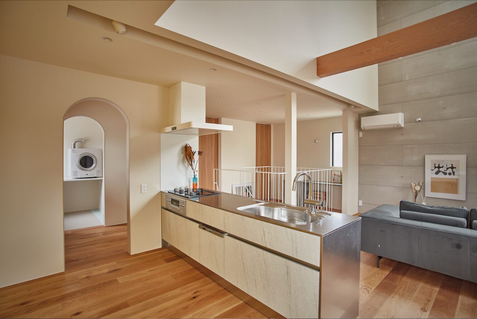 リビングと一体となったオープンキッチンが、視線の抜ける開放感と心地よい一体感を生み出します。機能性にもこだわり、キッチンのすぐそばにはアーチ型の入り口が印象的なランドリールームを配置。家事動線をスムーズにしながら、デザイン性を損なわない工夫が施されています。
