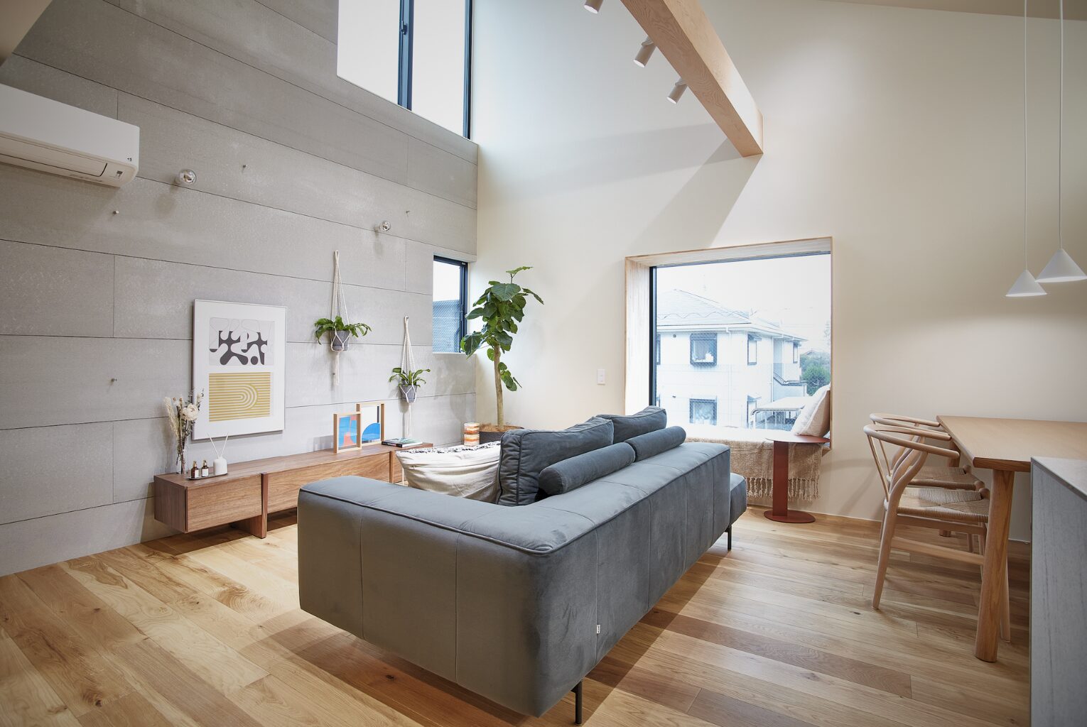 片流れ屋根の美しいフォルムを活かし、ハイサイドウィンドウ(高窓)からたっぷりの自然光を取り込むリビング。天井の高さと大きな窓がもたらす開放感が、視覚的にも心地よい広がりを生み出します。